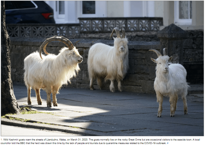[2] For photographs, see Taylor, Alan. 2002. “Wild Goats Roam Through an Empty Welsh Town.” The Atlantic, March 31. https://www.theatlantic.com/photo/2020/03/photos-llandudno-goats/609160/. For video, see @Reuters on Twitter, March 31, 2020, https://twitter.com/Reuters/status/1245073377724940294.